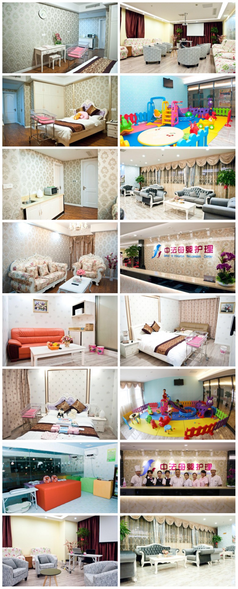 中法國際月子中心南湖中心位于嘉興市南湖區(qū)廣宜路859號南湖商會大樓(萬達廣場對面),斥資五千萬,有48個獨立的房間,有標準溫馨、升級貴賓、至尊VIP、總統(tǒng)套房不同的房間供顧客選擇。每一個房間每一對母嬰都有月嫂進行一對一,二對一甚至三對一的全天候服務(wù),是中法國際月子中心的特色之一。除此之外,月子中心內(nèi)有貼心細致的中醫(yī)調(diào)理,寶寶護理等多項服務(wù),特別注重醫(yī)學(xué)級別的消毒、洗浴、母嬰調(diào)理和產(chǎn)后康復(fù)等等。在月子中心的每一個房間,每周一次會有專業(yè)兒科、產(chǎn)科、婦科醫(yī)生進行巡房檢查。具有25年酒店管理經(jīng)驗的專家為護理中心入住的產(chǎn)婦提供五星級酒店式管家服務(wù),長期從事婦保院飲食調(diào)配的一級廚師為產(chǎn)婦提供豐富美味的月子料理。另外,月子中心經(jīng)常舉辦胎教音樂會、寶貝攝影大賽、親子暢享卡等活動,每到節(jié)假日的活動更是精彩紛呈。